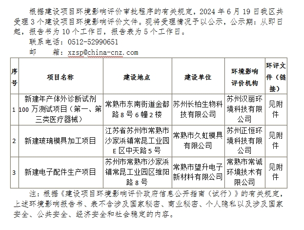 2024年6月19日常熟高新技术产业开发区受理环境影响报告书(表)情况的公示